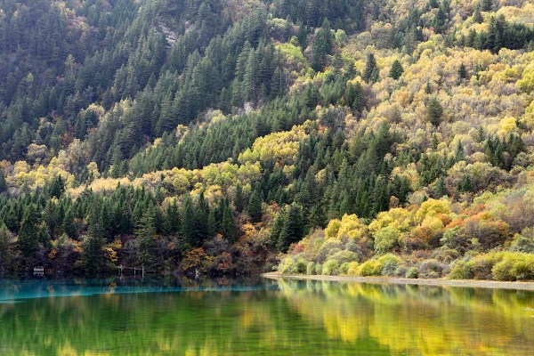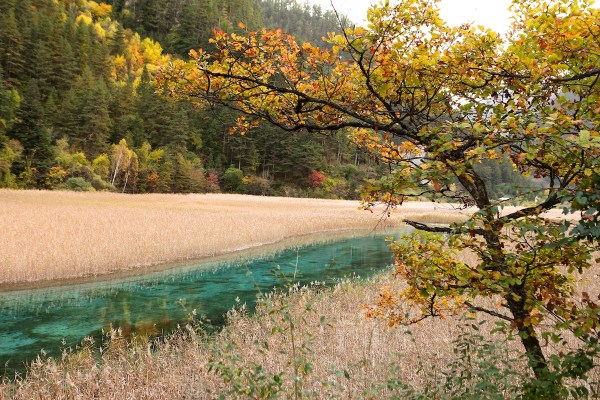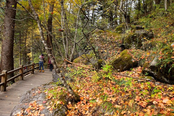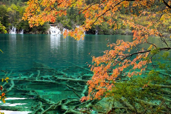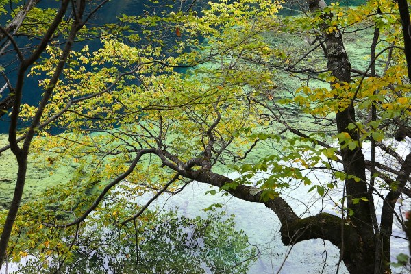 วิวที่นี่สวยจริงๆ สวยแบบในรูปที่เห็น น้ำใสละลายจากหิมะบนเขาสูงไหลผ่านธรรมชาติทิวเขาป่าครึ้ม เหมือนภาพระบายหลากสีสันที่จัดจ้าน แหงนหน้ามองด้านบนก็เห็นสีส้ม เหลือง แดงของใบไม้เปลี่ยนสี มองลำธาร น้ำใสก็มีสีสันงดงาม แต่งแต้มด้วยธรรมชาติที่ผ่านกาลเวลา และการปรับแต่งทางเดินให้รื่นรมย์ เดินง่าย วันอากาศดีดี ที่เราได้เดินผ่าน บางช่วงน้ำนิ่ง สะท้อนเงาใสดังกระจก น้ำตกใหญ่อลังการ และทิวทุ่งหญ้า ตามทาง ธรรมชาติหลากหลายอยู่ในอุทยานจิ่วไจ้โกวแห่งเดียว การเที่ยวก็แสนสะดวก ทั้งช่องทางเดิน หรือขึ้นรถบัสที่จัดบริการไม่มีขาด