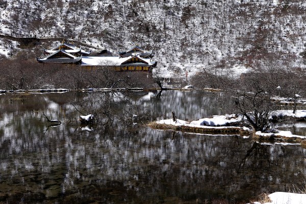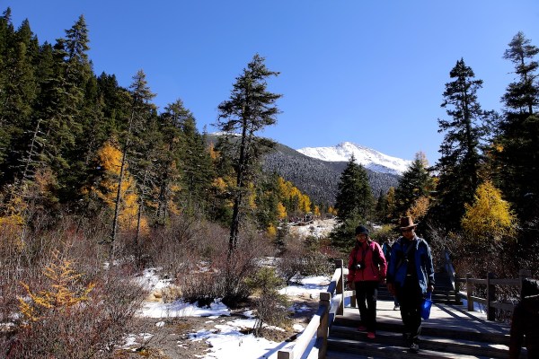 พวกเราเก็บกระเป๋า พร้อมออกเดินทางตั้งแต่ 7 โมงเช้า ใช้เวลาเดินทางประมาณ 3 ชั่วโมง รถพาเรากลับไปทางเดิมที่เราเดินทางมาจิ่วไจ้โกว ผ่านสนามบินที่เราจะต้องมาขึ้น แล้วมีทางแยกไปเที่ยวหวงหลง ยิ่งสูง อากาศยิ่งหนาว หลับๆตื่นๆ เพราะออกเดินทางกันแต่เช้า ลืมตามาอีกทีพบว่าสองข้างทางขาวโพลนไปด้วยหิมะ ระหว่างทาง เต็มภูเขา มิน่าล่ะ วันที่เราติดต่อขอเหมารถ เค้าถึงบอกว่าอาจจะมาไม่ได้ ถ้าหิมะตกหนัก แต่ก็โชคดีได้มาตามโปรแกรมที่วางไว้ คนขับรถพาเราแวะจุดถ่ายรูปบนเขา มองเห็นมุมสูงบนยอดเขา เป็นทิวเขาที่ปกคลุมด้วยหิมะ ขาวโพลน สวยงาม อากาศเย็น แต่แดดตอนเช้าก็ทำให้อบอุ่นได้ มีเวลาแวะกันไม่นานเพราะเราควรจะต้องไปถึงที่อุทยานหวงหลง ซัก 10 โมง เพื่อจะนั่งกระเช้า และมีเวลาเดินลงมาถึงจุดนัดพบประมาณบ่ายสองโมง เพื่อจะได้ใช้เวลาขับรถกลับอีกชั่วโมงครึ่งเพื่อไปถึงสนามบินประมาณ บ่ายสามโมงครึ่ง ไม่เกินสี่โมง เนื่องจากเราต้องขึ้นเครื่องต่อไปซีอานเวลา ห้าโมงเย็น