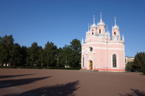 เราออกจากบริเวณสวนด้านหลัง และบังเอิญพบกับอาคารหลังน้อยสีชมพูพาสเทลสะดุดตาท่ามกลางท้องฟ้าสีคราม นั่นคือ โบสถ์เชสม (Chesme Church) หรือชื่อเต็มว่า Church of Saint John the Baptist at Chesme Palace โบสถ์เล็กแต่โดดเด่นแห่งนี้สร้างขึ้นในปี ค.ศ. 1780–1788 โดยพระบัญชาของพระนางแคทเธอรีนที่ 2 เพื่อระลึกถึงชัยชนะของรัสเซียในการรบที่อ่าวเชสมกับจักรวรรดิออตโตมัน