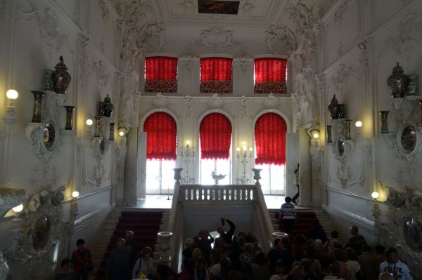 เมื่อก้าวเข้าสู่บริเวณพระราชวัง สิ่งแรกที่สะกดสายตาคืออาคารสีฟ้าอ่อนตัดกับกรอบสีขาวทองที่ส่องประกายภายใต้ท้องฟ้ากว้างใหญ่ อาคารหลักทอดตัวยาวเป็นร้อยเมตร ประดับด้วยองค์ประกอบสถาปัตยกรรมที่หรูหราในแบบบาโรกและโรโคโค หน้าต่างเรียงรายอย่างสมมาตร ซุ้มประตูโค้ง และลวดลายปูนปั้นล้วนเป็นงานศิลป์ที่ถ่ายทอดความโอ่อ่าของราชสำนักอย่างแท้จริง
