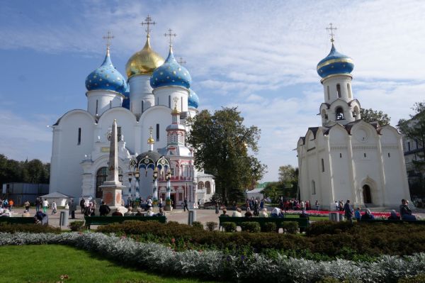 กลุ่มอาคารสีขาวแซมทองของ Trinity Lavra of St. Sergius ค่อยๆ ปรากฏขึ้นตรงหน้า สมกับที่ได้รับการยกย่องว่าเป็นหนึ่งในศูนย์กลางแห่งศรัทธาของรัสเซีย ผู้คนหลั่งไหลกันเข้ามาไม่ขาดสาย ทั้งนักท่องเที่ยวและชาวรัสเซียเอง โดยเฉพาะนักบวชที่ดูจะมารวมตัวกันเป็นจำนวนมากในวันนี้