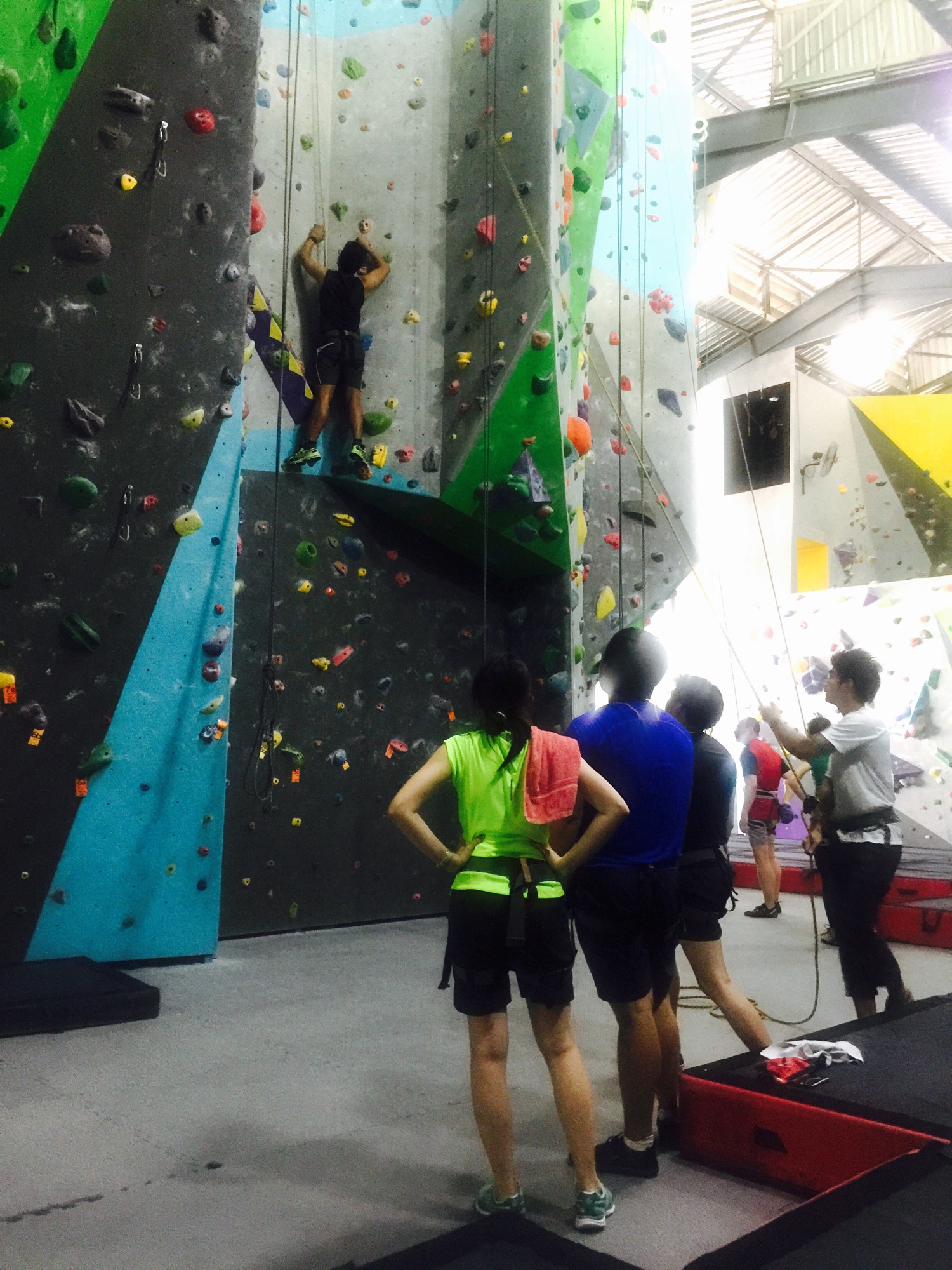 ยืนมองจากข้างล่างแอบเสียวๆเพราะความสูงนิดนึง แต่เห็นปุ่มสีเยอะแยะด้านบน ก็คิดว่าปีนไม่ยาก น่าจะทำได้