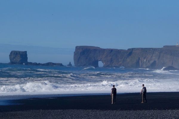 ต่อจากนั้นคือ Dyrhólaey หน้าผาหินโค้งริมทะเล ที่ชื่อแปลว่า “เกาะประตู” เพราะมีโค้งหินธรรมชาติยื่นออกไปในทะเลเหมือนประตูบานยักษ์ ถ้ามาช่วงฤดูร้อน เราอาจได้เห็น นกพัฟฟิน ตัวกลมๆ ปากสีสันสดใสเกาะอยู่เต็มหน้าผา แต่น่าเสียดาย ช่วงที่เรามานั้นพวกมันน่าจะย้ายไปอยู่ที่อื่นแล้ว เหลือเพียงสายลมแรงจนต้องก้าวขาต้านแรงลม และวิวของมหาสมุทรแอตแลนติกอันไกลโพ้น
