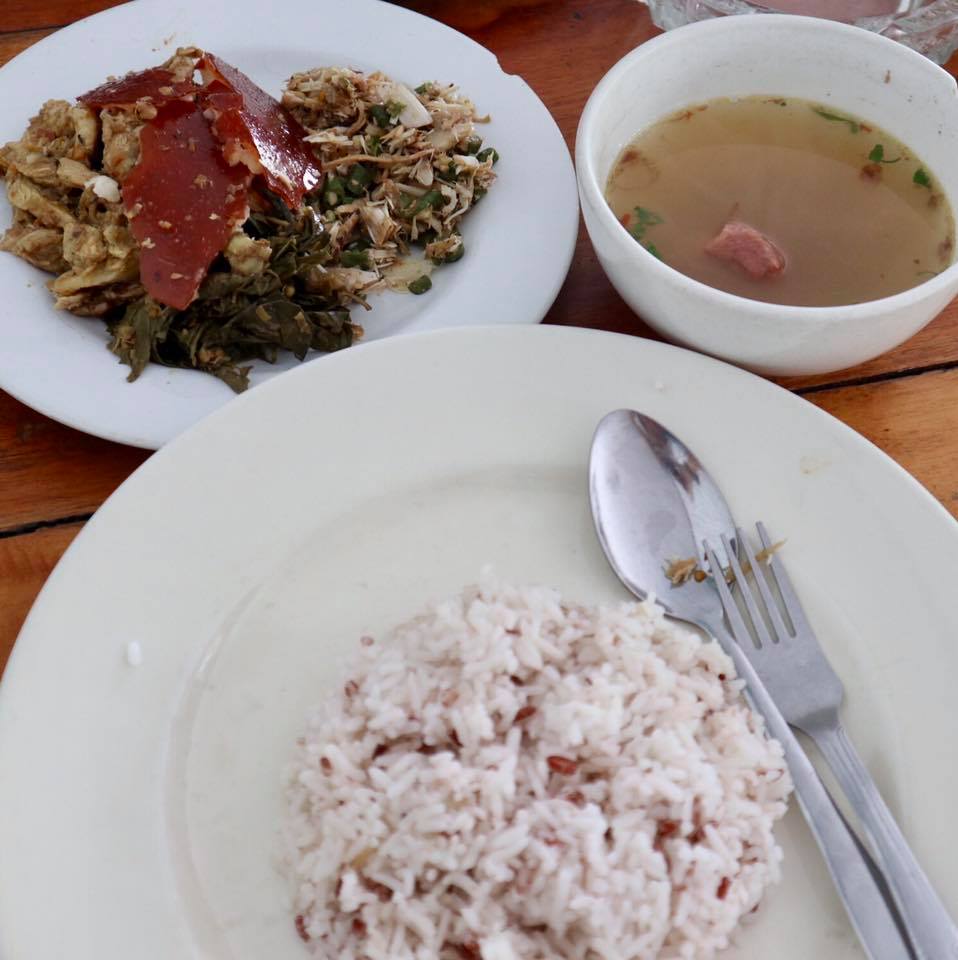 รสเผ็ดจัดจ้าน นอกจากหนังหมูกรอบๆ ยังมีเนื้อหมูผัดกระเทียม หมูยำตะไคร้ ไส้ทอด ตับผัด เสิร์ฟมาเป็นชุดพร้อมข้าวและน้ำซุป
