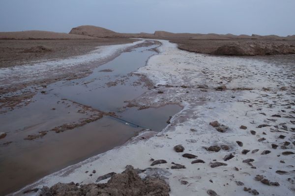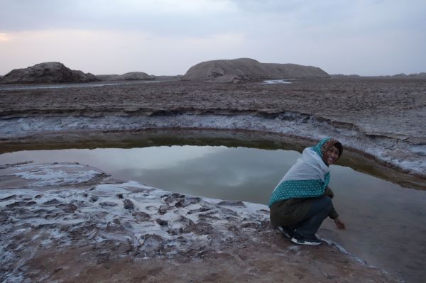 แม้วันนั้นท้องฟ้าจะไม่เปิด แสงแดดถูกบดบังด้วยเมฆ ทำให้เฉดสีของทรายแดงดูหม่นไปบ้าง แต่ความงามของธรรมชาติยังชวนให้ตะลึง ร่องรอยสีขาวที่เห็นจากระยะไกลคล้ายแอ่งน้ำ แต่คุณ Iraj อธิบายว่านั่นคือคราบเกลือที่ตกผลึกจากน้ำฝนที่ซึมลงพื้นอย่างรวดเร็วแล้วระเหยไป
