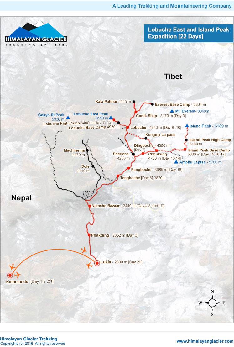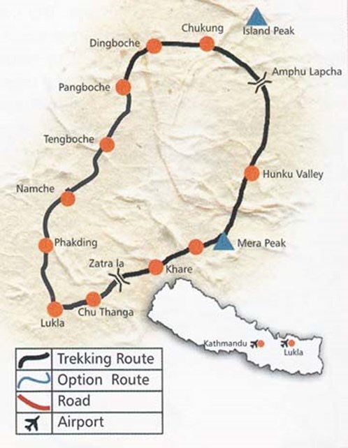 โดยใช้เส้นทางด้านตะวันออกของลุกลาเพื่อไป Mera Peak (6461 m.) ก่อน แล้วเดินข้าม Amphu Lapcha Pass (5845m. ) เพื่อขึ้นไปยัง Island Peak เส้นทางนี้ได้เดินเป็นวงกลมแบบไม่ซ้ำเส้นทางเดิม และยังได้ขึ้นยอด 2 แบบ