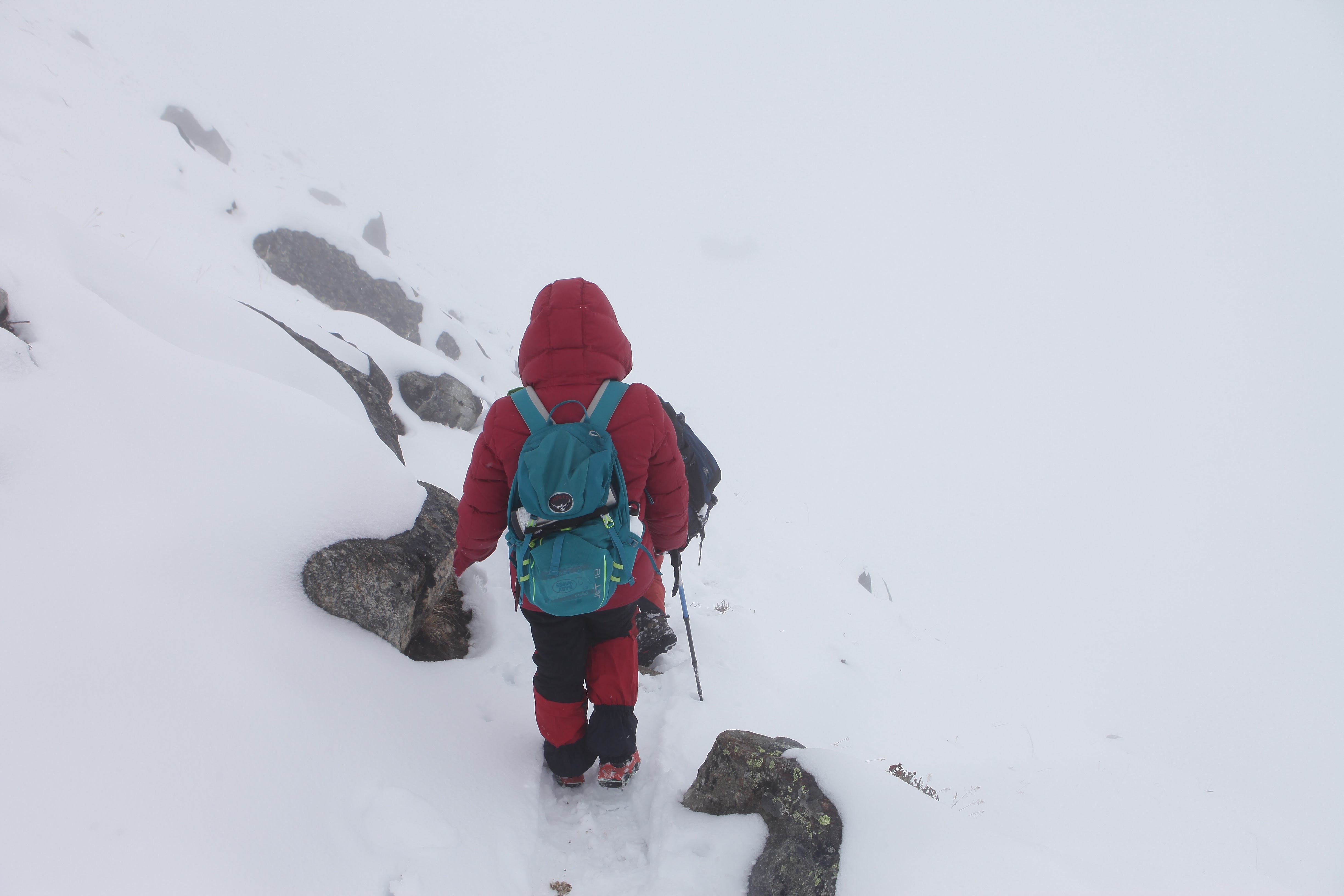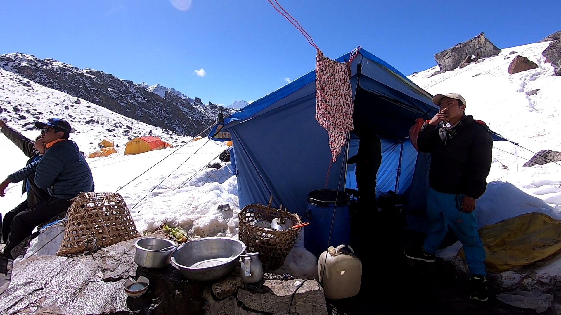 แต่ละวันผ่านไปแบบสบายๆ ไม่วุ่นวาย แม้ช่วงนี้จะเป็นช่วงที่ไฮซีซั่นของแต่ละปี แต่สองสามวันนี้ก็ไม่ถือว่าเป็นช่วงที่คนมาก เค้าว่าเคยมีมามากถึง 200 คน เวลาที่นี่ของฉันยาวนานเพราะเราตื่นกันแต่เช้าตี 5 กว่าๆ ก็ลุกออกมานอกเต็นท์ ชมวิวสวยๆขณะที่หาห้องน้ำตามธรรมชาติหลังก้อนหินน้อยใหญ่ที่อยู่รอบๆ เดินชมวิวไปรอบๆ แป็บเดียวก็ทั่วแล้ว แต่สายหมอก ปุยเมฆที่เคลื่อนตัวผ่านยอดเขา ทำให้เวลาที่ผ่านไปอย่างเชื่องช้าไม่น่าเบื่อเกินไป ฉันละสายตามบางขณะมองขึ้นไปบนยอดเขา เห็นจุดเล็กๆสีดำค่อยเคลื่อนไปบนยอดสูง เราสามารถมองเห็นคนที่กำลังฝ่าฟันพยายามจากจุดนี้ เมฆครึ้มค่อยๆเคลื่อนตัวเข้ามาพร้อมหิมะที่ตกในหลังเที่ยงทุกวันที่ฉันอยู่ที่นี่ ทำให้ต้องคอยลุ้นว่าคนบนนั้นจะเป็นอันตรายหรือไม่ ขอให้ลงมาอย่างปลอดภัยในขณะที่คนที่รอข้างล่างอย่างเราหลบเข้าไปพักอยู่ในเต็นท์ที่หิมะปกคลุมหนาขึ้น บางทีนั่นเป็นความสวยงาม ตื่นเต้นของคนที่อยู่ด้านล่างซึ่งมีต่อวิวสูงด้านบน จนไม่จำเป็นต้องไปหาความตื่นเต้นบนยอดสูงด้วยตัวเอง