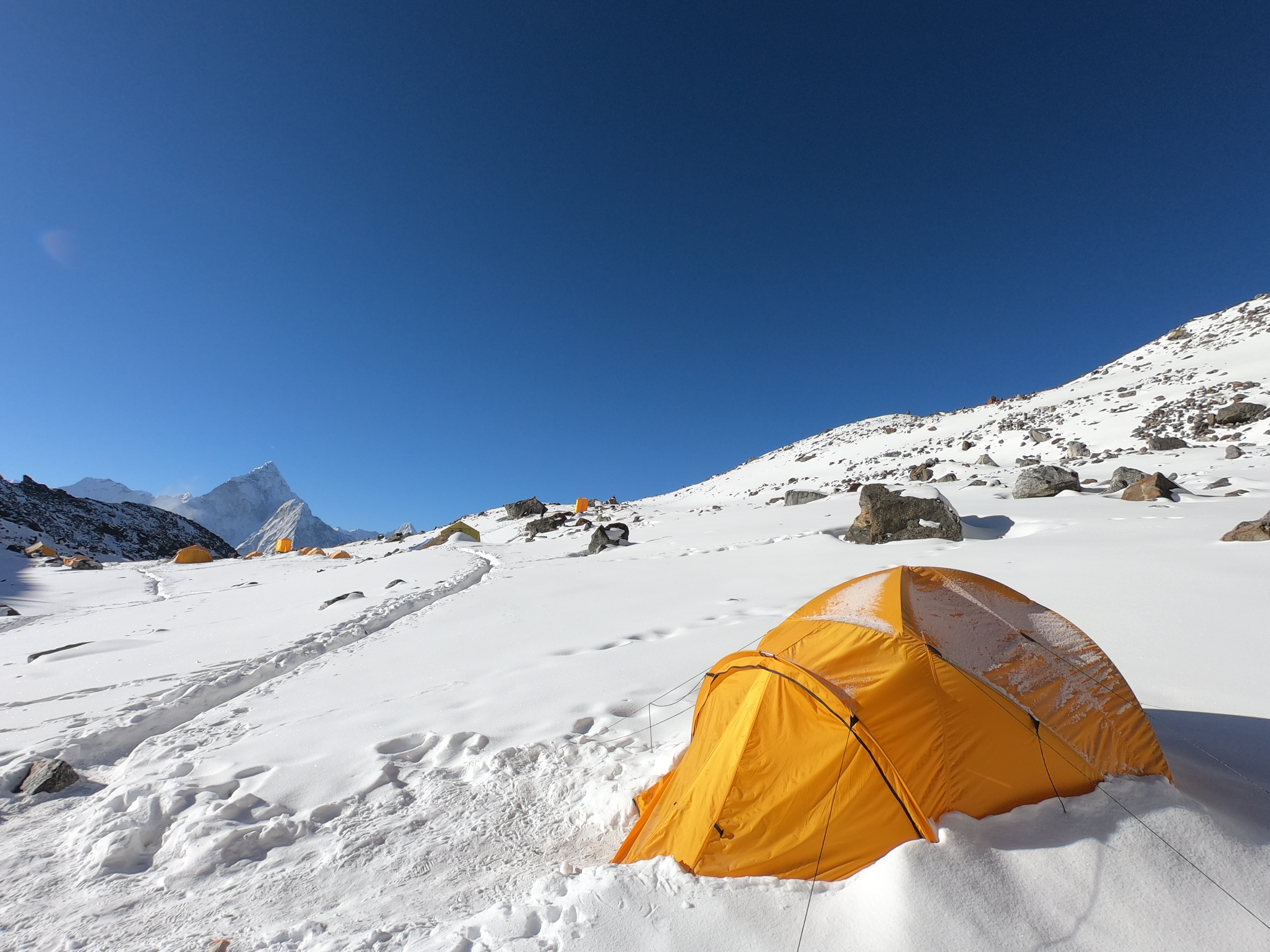 หิมะไม่ได้หนาเช่นวันนั้น มองทางชัดเจนและทำให้ฉันย้อนคิดไปถึงการตัดสินใจวันนั้นว่าถูกแล้วที่ยอมถอย เพราะทางที่เห็นวันนี้เป็นสันเขาแคบมาก หากเดินพลาดนิดเดียวสามารถกลิ้งตกเขาได้เลย แต่ทางแคบนี้ก็ยังลื่นเพราะหิมะละลายทำให้ต้องค่อยๆเดิน ใช้เทรคกิ้งโพลคอยช่วยป้องกันตัวเองเพื่อไม่ให้ลื่นล้ม เช้านี้อากาศยังดีเหมือนทุกเช้าที่ผ่านมา เราแวะพักชมวิวที่ตระการตาตลอดทางด้วยยอดเขาสีเงินของภูเขาหิมะรอบๆตัวเราเป็นระยะ หลังพ้นทางสันเขาแคบสิ่งที่รอเราอยู่ก่อนถึงเบสแค้มป์คือทางสูงชันที่ความสูงระดับ 5000 เมตร ทำให้เหนื่อยง่าย ทางยิ่งชัน ยิ่งต้องช้าลง แต่ใจของฉันกลับร้อนรนจนหัวใจเต้นแรงตึกตักๆ ฉันต้องเดินไปพักไป เพราะไม่สามารถปรับใจให้ไปกับสภาพทางชันซึ่งควรจะเดินให้ช้าที่สุด ลูกหาบที่ช่วยขนของขึ้นมาที่เบสแค้มป์ให้เราก็สภาพย่ำแย่ไปหลายคน เพราะแพ้ความสูง แต่พวกเขาก็เดินกันช้าๆ ฉันใช้วิธีปรับใจ ปรับความเร็วโดยการเดินตามเท้าที่ก้าวของลูกหาบที่แบกของหนักกว่า 30 กก. ขณะที่ฉันมีประมาณ 10 กก. ฉันรู้ว่าร่างกายตัวเองล้ามาก เท้าก้าวไม่ออก ยกขาแทบไม่ขึ้น ใจมองหาแต่ปลายทางหวังจะพบทางราบเพื่อจะเดินได้สบายขึ้น หิมะตกหนักลงมาระหว่างทาง ฉันว่าช่วงเวลานั้นเป็นเวลาที่ฉันแย่ที่สุด ฉันกลัวตัวเองจะป่วย เป็นหวัด ปวดหัว ยิ่งกลัวก็ยิ่งเร่ง ใจยิ่งเต้นแรง สุดท้ายแล้วก็สงบสติอารมณ์ด้วยการพัก นั่งเฉยๆ ท่ามกลางหิมะตกหนักพักใหญ่ พอตั้งสติทั้งกายใจได้ก็ค่อยเดินแบบเท้าชนเท้าค่อยๆเดิน โดยไม่สนใจปลายทางข้างหน้า พอใจสงบลง ก็พบว่าใช้เวลาไม่นานฉันก็มาถึงยอดด้านบน พบลานกว้างเต็มไปด้วยหิมะขาวโพลน โดยมีเขาสูงเด่นตระหง่านขวางอยู่ไกลๆ ใกล้ๆเชิงเขามีเต็นท์สีเหลืองถูกกางรออยู่ ที่นี่คือเบสแค้มป์ ของยอดเขาโลบุเช่ (Lobuche Basecamp) เป็นปลายทางวันนี้ของเรา ฉันเดินโซซัดโซเซไปหาเต็นท์ของฉัน โยนทุกอย่างออกจากหลัง แล้วล้มตัวลงนอนคลายความเมื่อยและเหนื่อยล้าจากการเดินวันนี้