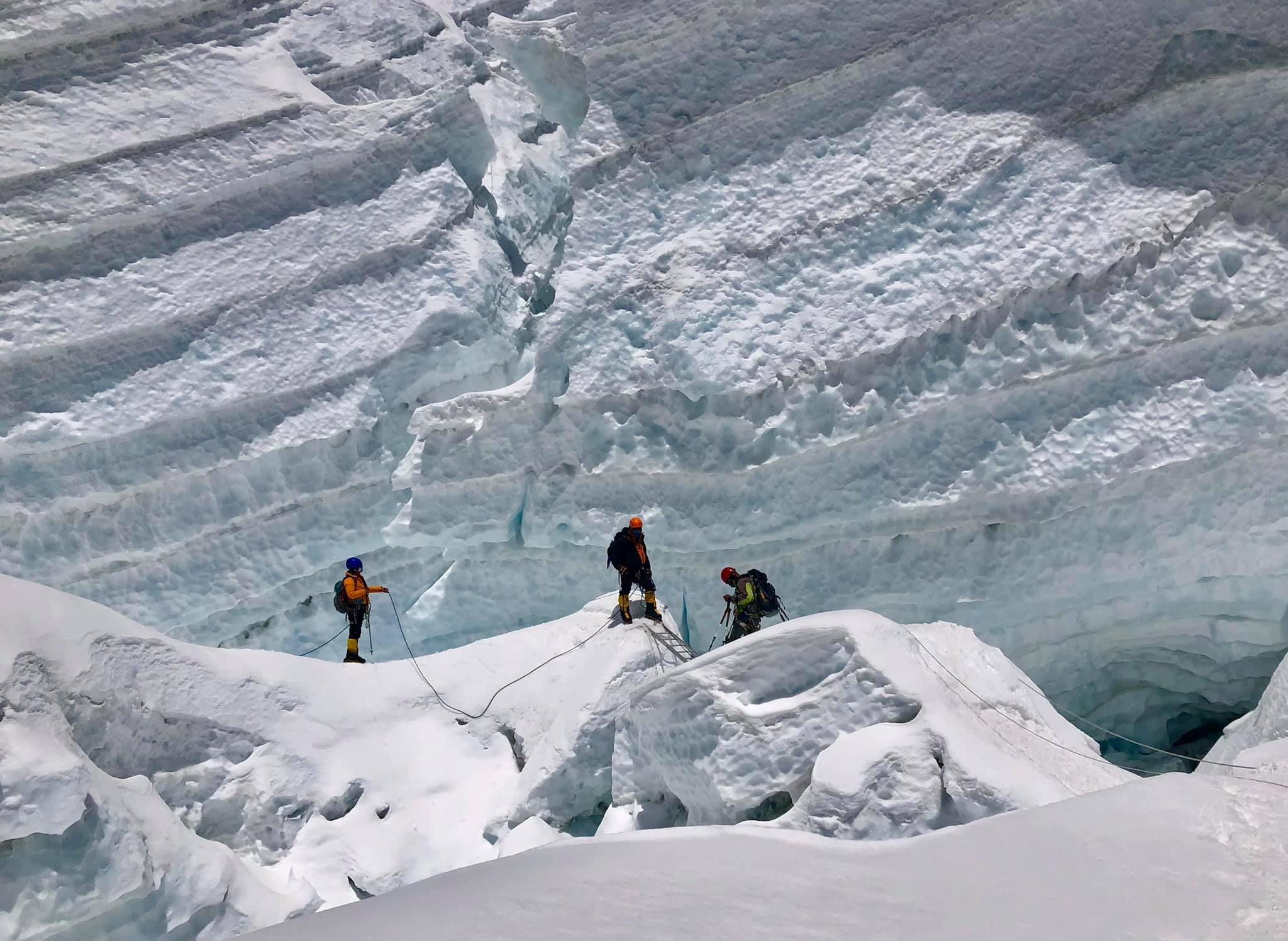 แต่เมื่อมายืนตรงนี้ทางเลือกเดียวก็คือพุ่งตัวเองขึ้นไป ยิ่งขึ้น ยิ่งล้า ไกด์นิรูคอยดูแลช่วยเหลือฉันเป็นอย่างดี ฉันขยับเชือกที่ใส่จูม่า ดึงตัวเองขึ้นไปสูง แต่ก็ไม่ถึงซะที ฉันพยายามช่วยเหลือตัวเองให้มากที่สุดเพราะไกด์ก็ต้องดูแลคนอื่น ขึ้นไปๆ จนหมดแรงแขน หิมะน้ำแข็งจากด้านบนก็ไหลสวนทางเพราะคนข้างบนก็ใช่ว่าเก่งกันนัก ระหว่างตอนค้างรอค่อยๆขึ้น มีทั้งหิน ทั้งน้ำแข็งร่อนลงมาอย่างหนักช่วงหนึ่ง ฉันซึ่งอยู่ด้านล่างมองหินใหญ่และก้อนน้ำแข็งอย่างตกใจ แล้วต้องหลบซ้ายขวายังกะหลบกระสุน สุดท้ายก็ลงมารัวๆ ต้องก้มหน้ามุดกับหิมะเก็บคองอเข่าซุกตัวกับหิมะ คิดว่า helmet คงช่วยบังเกล็ดหิมะ น้ำแข็งและหินไม่ให้ตกใส่ศีรษะได้บ้าง ก่อนจะรอให้ทุกอย่างพอสงบลงแล้วจึงค่อยเงยหน้าขึ้นมามองเหตุการณ์รอบตัว