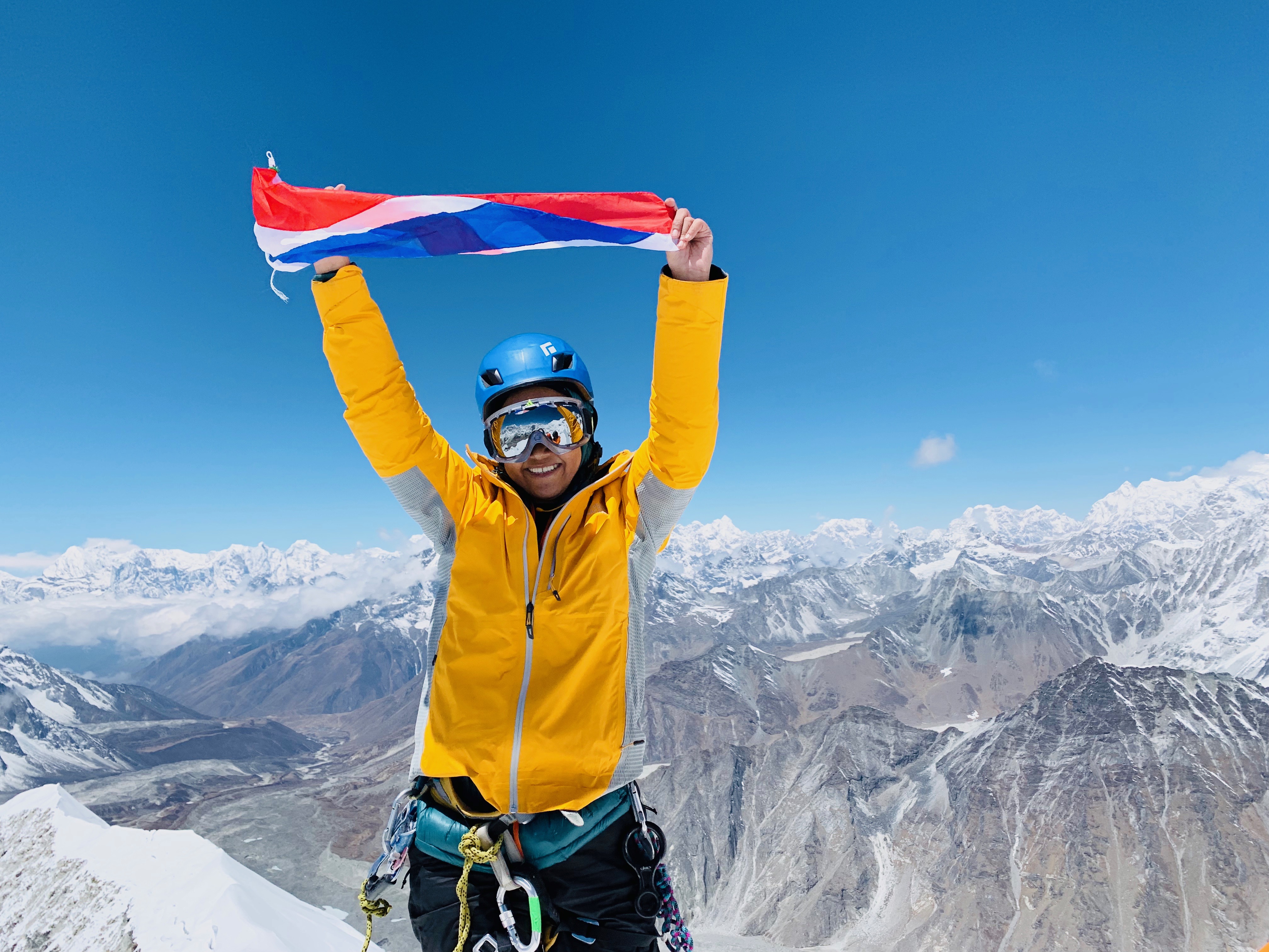 ในขณะที่พยายามอยู่นั้น ความคิดของฉันคิดว่ามันเนิ่นนานเหลือเกินแต่จริงๆแล้วก็คง 20-30 นาทีอย่างเค้าว่าแหละ ไกด์นิรูชี้ให้ดูเมื่อเห็นยอด แล้ววิ่งขึ้นไปดักรอถ่ายรูปให้ ปล่อยให้ฉันขึ้นไปด้วยตัวเอง ยอดนิดเดียวเวลานี้มี 3 คนยืนรออยู่ พี่นคร บอล นิรู ทุกคนเหนื่อยแต่ดูดีใจ ถ่ายรูปกันรอบทิศทาง ต้องยอมรับว่าอากาศวันนี้ดีจริงๆ ฉันขึ้นมานั่งหอบ พร้อมทั้งสงสัยว่านี่มันใช่ความสามารถของฉันจริงเหรอที่ขึ้นมา มันสาหัสสากรรจ์จริงๆ มีข้อสงสัยมากมาย แต่ฉันก็มานั่งบนยอดเล็กๆที่ยืนกันได้แค่3-4 คน พวกเรา ฉันมาถึงเป็นคนสุดท้ายของวัน เราเลยถ่ายรูปกันเต็มที่