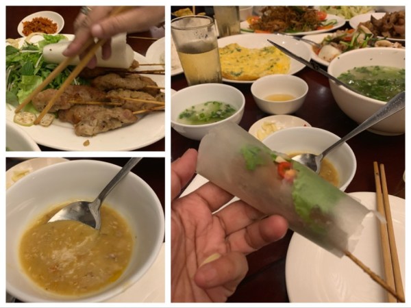 อาหารเย็น มื้อนี้คล้ายๆกับมื้อกลางวัน แต่มีแหนมเนืองหรือหมูเนืองแบบของเวียดนามแท้ๆให้ได้ลองชิม ซึ่งของที่นี่นั้นแป้งจะบางและกรอบกว่าแหนมเนืองที่เราทานในเมืองไทย