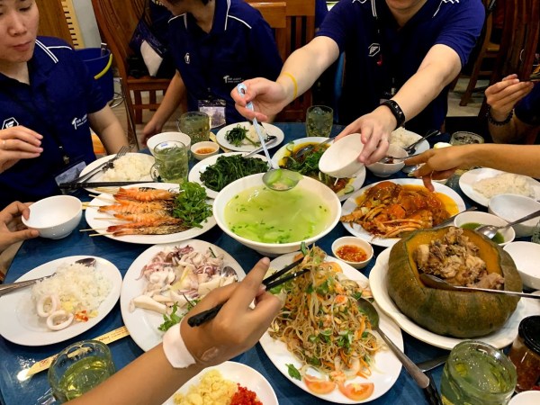 มาถึงดานังในวันที่ร้อน ไม่มีฝน ออกจากสนามบินเราก็มุ่งตรงไปที่ร้านอาหาร นั่งรถประมาณ 15 นาที ทัวร์จัดอาหาร 8 อย่าง สำหรับโต๊ะละ 7 คน อาหารเต็มโต๊ะ ทานกันไม่หมด อาหารคล้ายอาหารไทยผสมจีน บางอย่างแปลกตาไม่เคยทานมาก่อน เช่นกุ้งผัดกับหัวปลีที่หั่นฝอยๆ , ไก่ผัดอบในลูกฟักทอง รสชาติอาหารกลางๆไม่จัด มีความมัน แต่ก็มีน้ำจิ้มเพื่อเพิ่มรสชาติและตัดความเลี่ยน ทางร้านจัดอาหารมาสวยงามปริมาณเต็มที่ นอกจากไก่ ก็มีกุ้ง ปลาหมึก กั้ง และปลา ผัดผักรสชาติดี โดยรวมถือว่าเป็นมื้อแรกที่น่าประทับใจ และจัดเต็มมาก