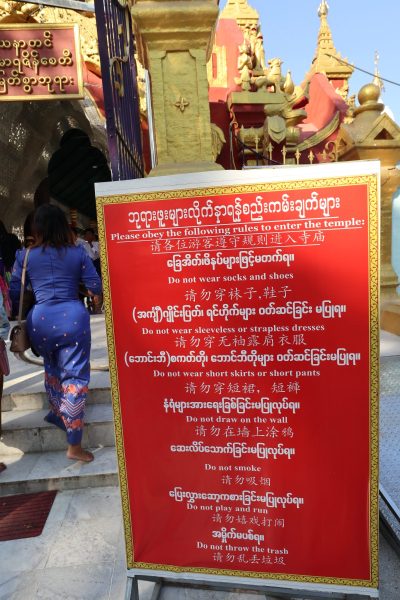 - ต้องถอดรองเท้า รวมถึงถุงเท้าตั้งแต่รั้วด้านนอก เป็นธรรมเนียมที่เคร่งครัดมากตั้งแต่สมัยโบราณ หากฝ่าฝืนอาจถูกชาวพม่าจะเข้ามาตักเตือนด้วยความไม่พอใจ