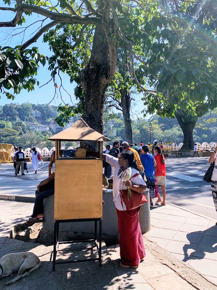 ฉันนั่งรถไฟสายเอลล่า-แคนดี้มาลงที่ปลายทางเมืองแคนดี้ เป็นการเดินทางจากบนภูเขาผ่านป่าไม้ ไร่ชา น้ำตก ผู้คนจากชนบท ทิวทัศน์และวิถีชีวิตค่อยๆเปลี่ยนจากความเบาบางเป็นความหนาแน่นขึ้นอย่างน่าตื่นตาตื่นใจ ที่สถานีรถไฟแคนดี้คือปากประตูที่เปิดออกให้เห็นภาพเมืองคับคั่ง เสียงบีบแตรรถระงมดังทั้งเมือง ฉันแบกเป้เดินเบียดผู้คนมากมายออกมาเรียกตุ๊ก ตุ๊ก ไปที่พักที่ห่างไป 1.5 กม. การจราจรในเมืองมีความอลหม่านบนถนนสายไม่ใหญ่ มีรถคราคล่ำมากมายหลายประเภททั้งรถเก๋ง รถเมล์ รถบัส รถมอเตอร์ไซค์ ถนนในเมืองเป็นเนินสูงต่ำตามภูมิประทศบนเขา ทั้งที่วุ่นว่ายแต่กลับมีความเคารพกฎจราจรอย่างเคร่งครัด เมื่อคนขับแทบทุกคันจอดรถเบรคเอี๊้ยดทันควันเมื่อมีคนจะข้ามถนนบนทางม้าลาย เล่นเอาฉันที่นั่งบนรถเกือบหน้าคว่ำไปหลายรอบ