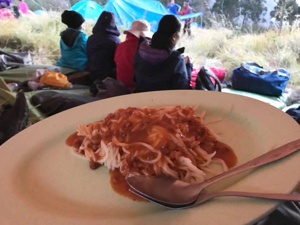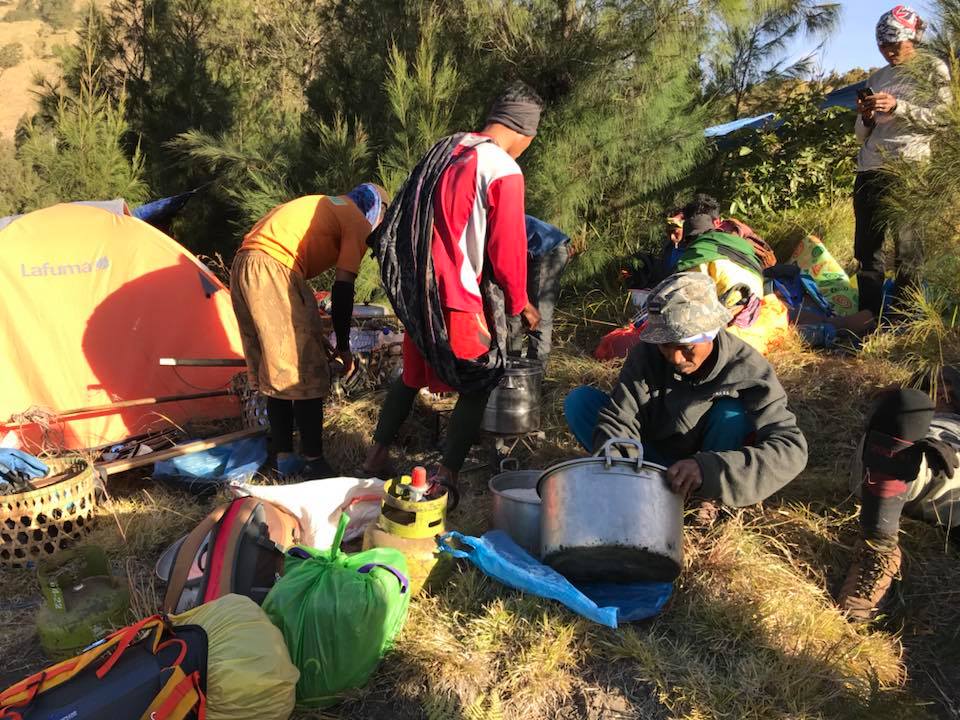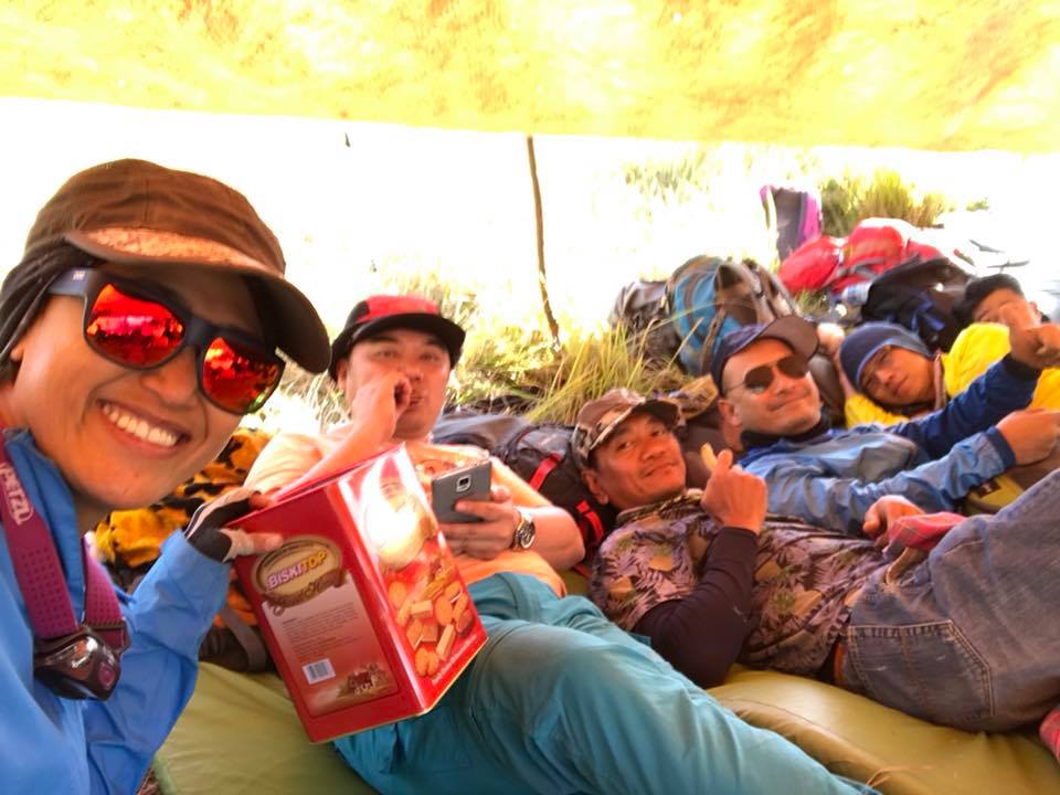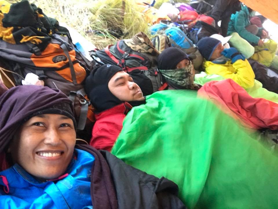 พวกเราเตรียมตัวเข้านอนโดยนอนรวมกันในเต็นท์หลังใหญ่ที่มีเพียงแผ่นฟลายชีทมาทำหลังคา แล้วยึดกับเสาไม้ ใช้เทรคกิ้งโพลช่วยค้ำยัน ไกด์เอาแผ่นรองนอนมาปู พร้อมถุงนอนเพื่อกันหนาวคืนนี้ ตอนเย็นพ่อครัวและลูกหาบก็ทำอาหารเสริฟก่อนนอน