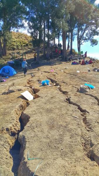 เมื่อขึ้นไปถึงสันเขาบริเวณ Sembalun crater เราเห็นรอยแยก ร่องรอยความเสียหาย จนถึงขณะนี้ยังไม่ได้ข่าวความสูญเสียจากกลุ่มคนไทยที่ขึ้นยอดเมื่อวันก่อน และหวังว่าจะไม่มีอะไรร้ายแรงเกินไป