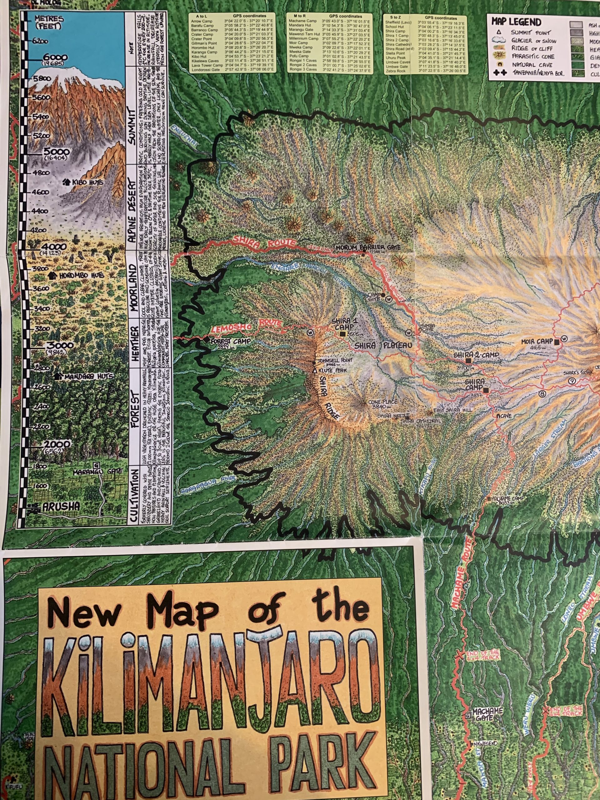 - ยอดชีรา (Shira) ความสูง 3,788 เมตร การระเบิดปะทุเมื่อเกือบสองล้านปีก่อน ทำให้ยอดเขาชีรา (Shira) ทะลายลงมา แล้วถูกทับด้วยลาวาที่ไหลลงมาจากการการระเบิดของยอดคีโบ เกิดเป็นแอ่งที่ราบสูง Shira ซึ่งหากเดินเทรคในเส้นทางนั้นก็น่าจะคล้ายๆว่าเดินตัดผ่านแอ่งภูเขาไฟ Shira