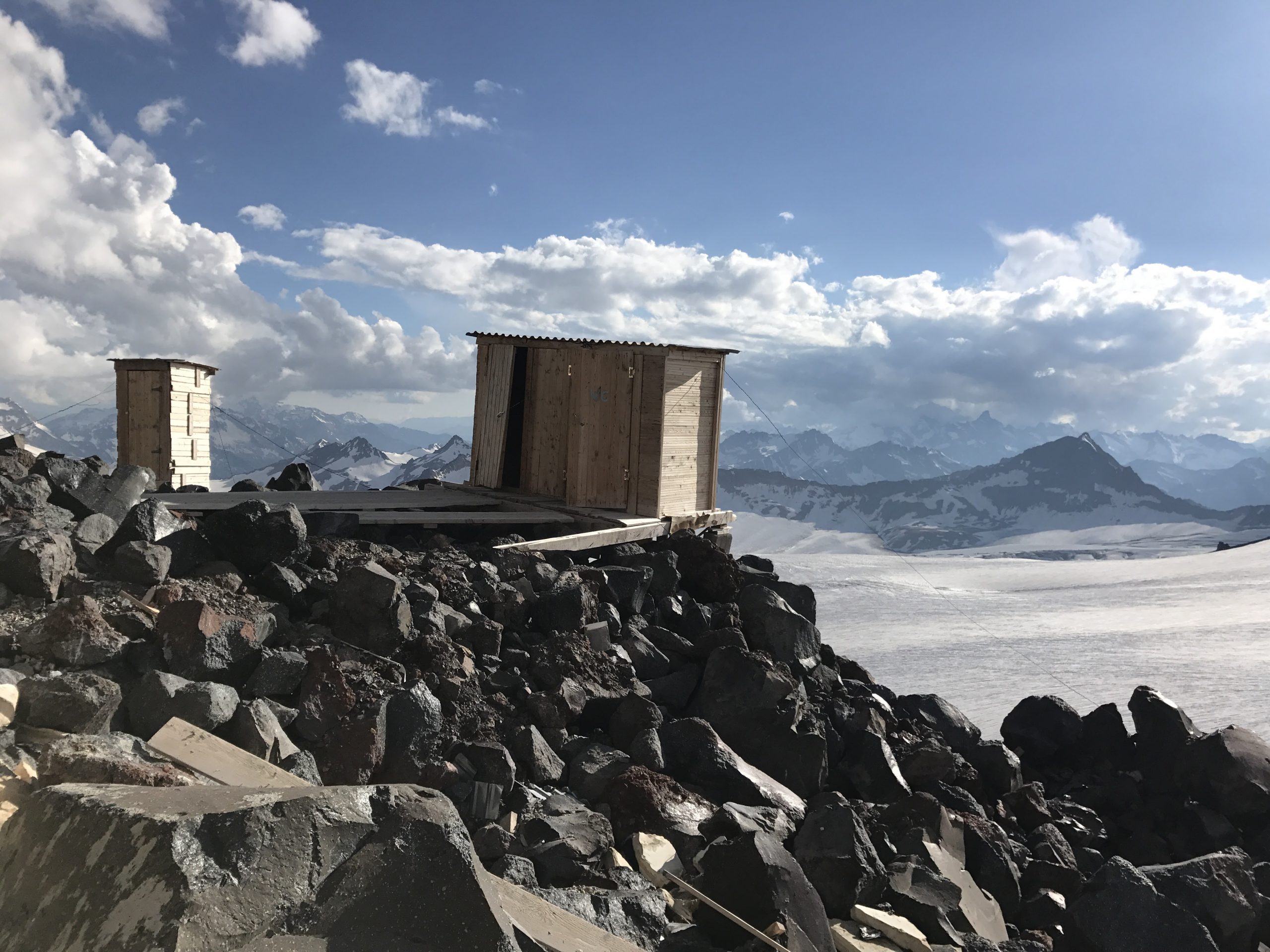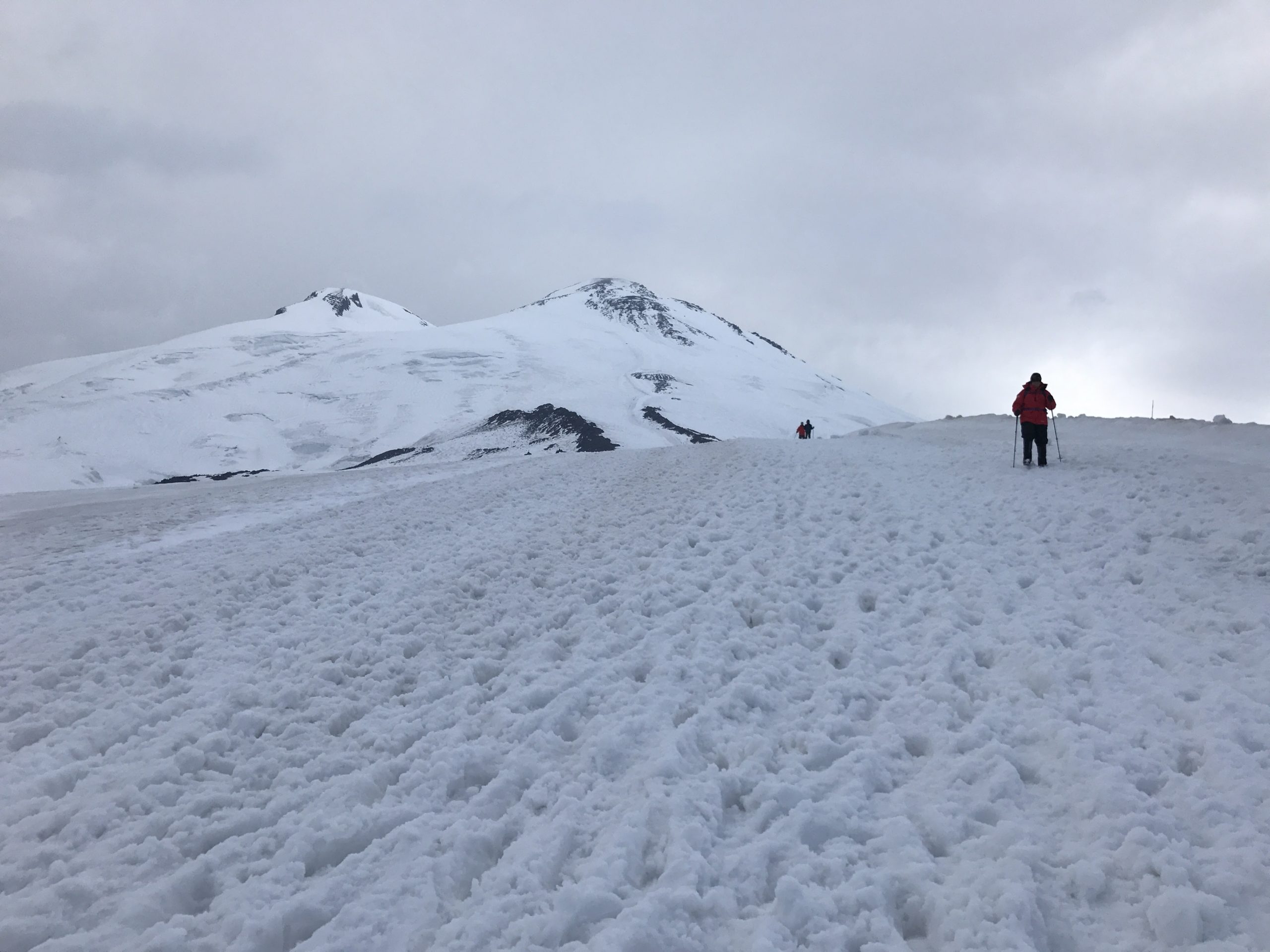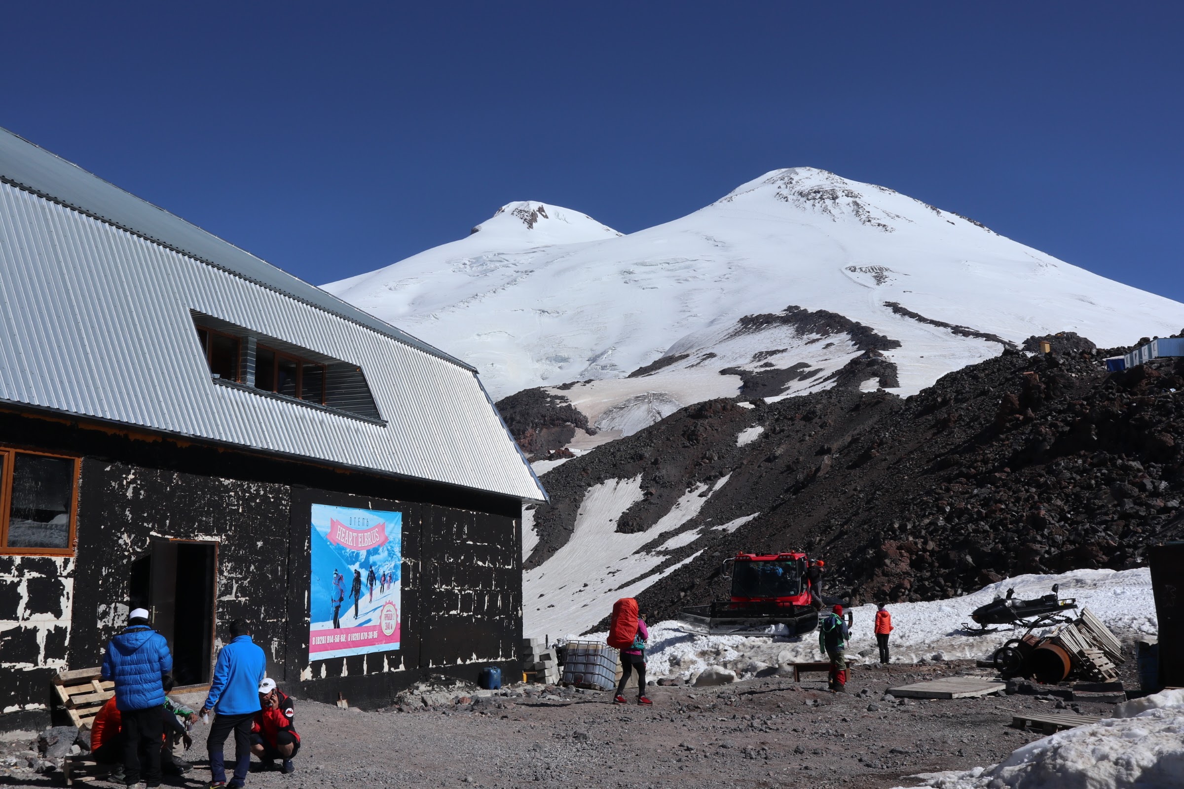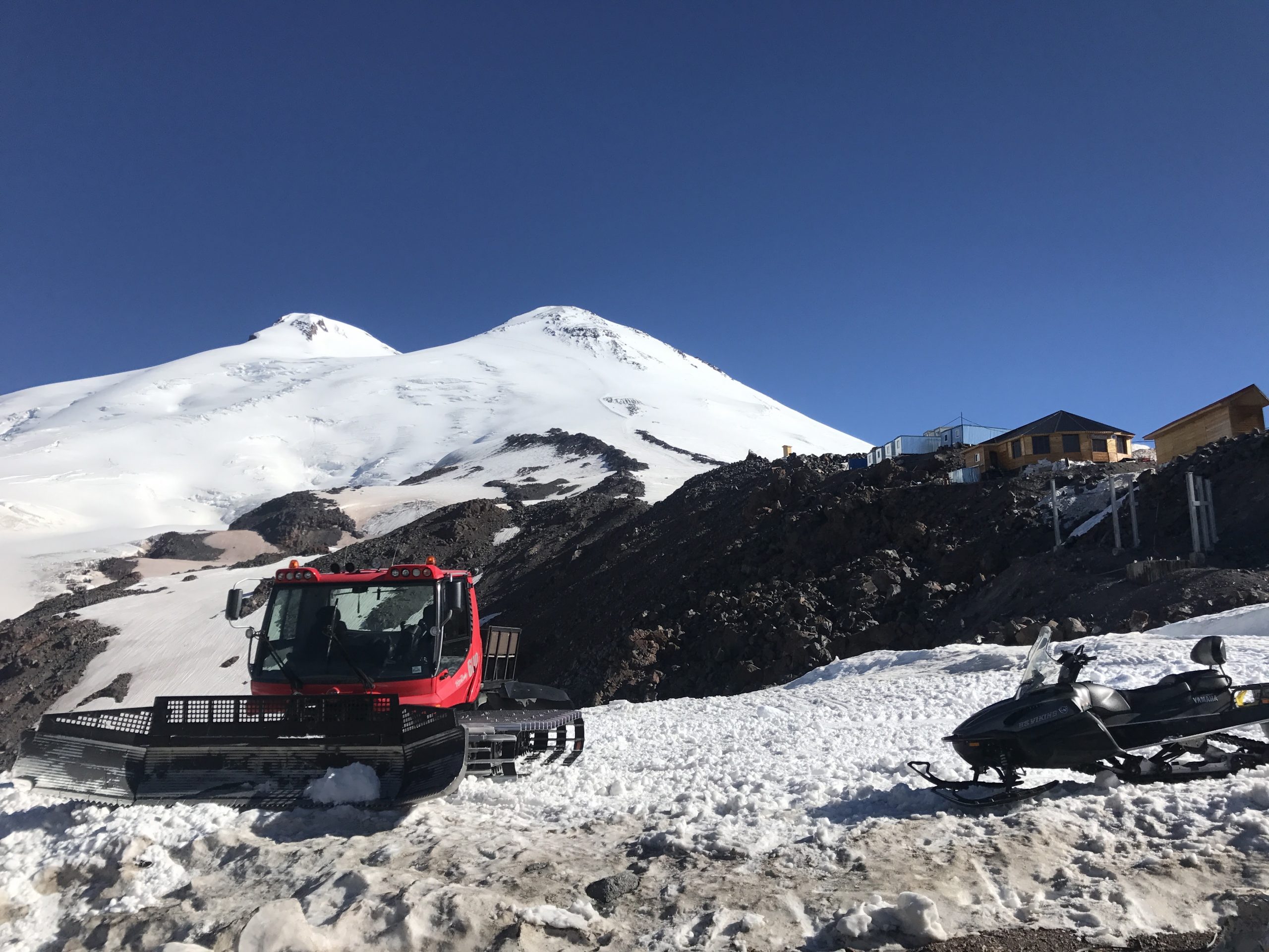 จากระดับ 2,000 เมตร ที่เมือง Terskol เรานั่ง cable car มาต่อ chair lift นั่ง snowcat ก็มาถึงที่พักที่ความสูง 3,840 ม. จากทุ่งหญ้าสีเขียว มาถึงเทือกเขาสีขาวที่หนาด้วยหิมะ พอลงจากรถเท้าย่ำลงไปบนพื้นหิมะหน้าที่พักก็รู้สึกว่าชีวิตชักจะคลอนแคลนไม่มั่นคง อากาศหนาวเย็นขึ้นเมื่อเราอยู่บนความสูงระดับนี้ ในวันที่ท้องฟ้าขุ่นมัวอึมครึม