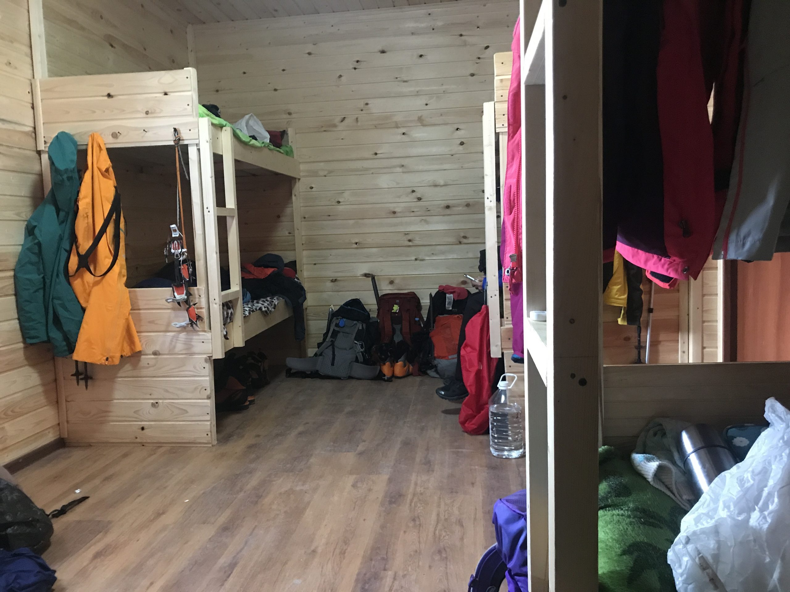 แค้มที่พักเหมือนโกดังใหญ่ ได้ข่าวว่าเป็นที่พักที่เพิ่งทำใหม่ไม่นานนัก ที่แค้มป์นี้เปิดให้บริการตลอดปี แต่ช่วงนี้ (เดือนกรกฎาคม-สิงหาคม)จะถือเป็นช่วงไฮซีซั่นมีนักท่องเที่ยวมากกว่าปกติเพราะจะมีบรรดานักเดินเขาอย่างพวกเราเข้ามาพักด้วยนอกเหนือจากพวกที่ชอบเล่นกีฬาแอดเวนเจอร์หรือเล่นสกีหิมะซึ่งมาเป็นปกติ ที่พักมี 2 ชั้น ห้องอาหาร 3 ห้อง ห้องน้ำอยู่ด้านนอกริมหน้าผาบรรยากาศดี 3 ห้อง ห้องพักน่าจะมีประมาณ 12-15 ห้อง แต่ละห้องพักได้ประมาณ 8 คน เราได้พักบนชั้นสอง