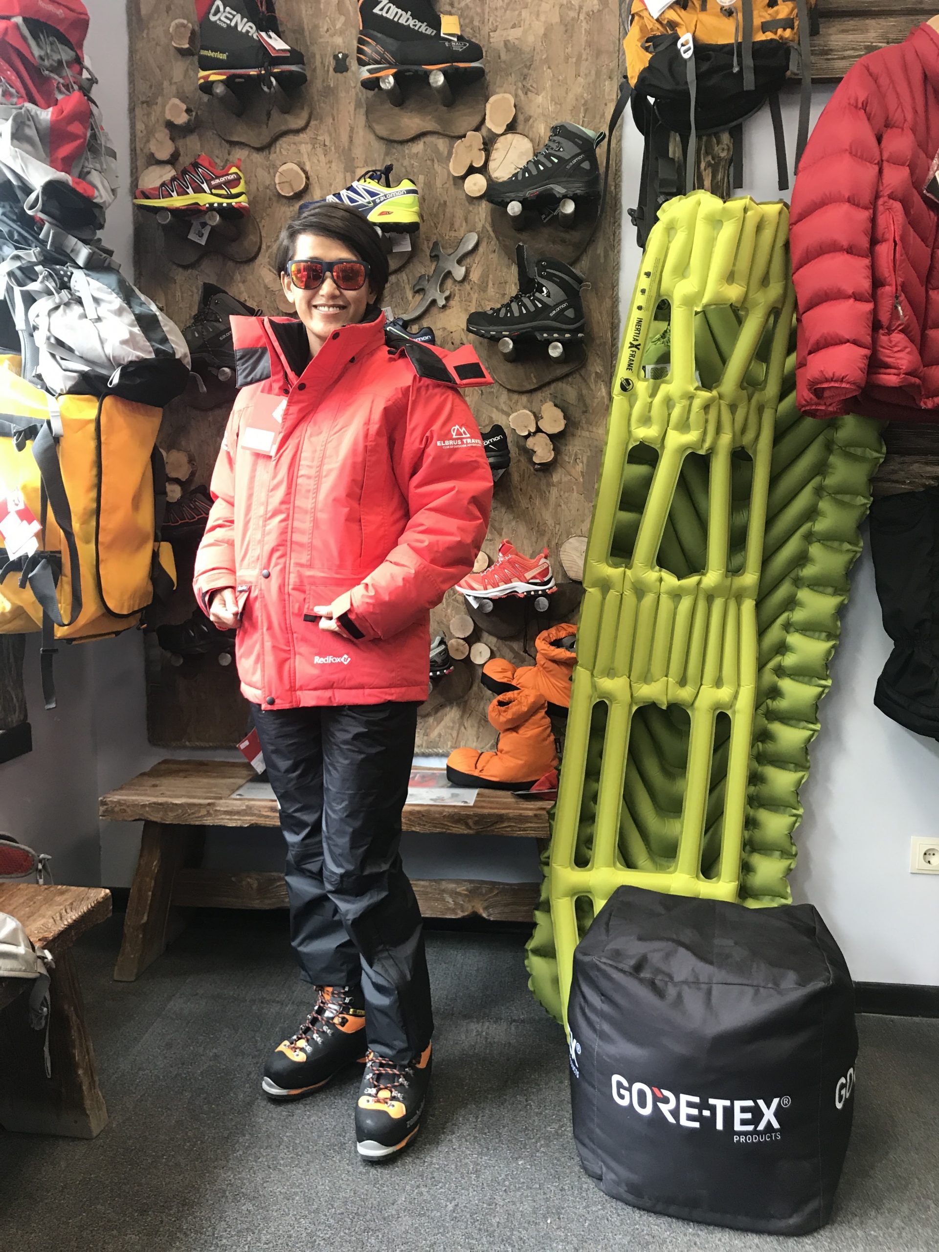 ที่ร้านเช่าอุปกรณ์ มีอุปกรณ์ใหม่ๆละลานตา น่าเป็นเจ้าของหลายอย่าง Redfox เป็นยี่ห้อ local ยอดนิยมของรัสเซีย อุปกรณ์ให้เช่ายังใหม่ชนิดแกะห่อ ติดป้ายใหม่ทีเดียว โดยเฉพาะเสื้อกันหนาวระดับกันหนาวคแถบขั้วโลกตัวเบ่อเริ่มที่ฉันเช่ามา นอกจากเสื้อยังมี รองเท้า double boots, crampon, harness , carabiner, และ ice-axe ที่ฉันเช่าจากที่นี่ หลังจากเก็บอุปกรณ์ใส่เป้ของตัวเองเพื่อเตรียมพร้อมออกเดินทางต่อ ฉันจึงพบว่าดีแล้วที่ตัดสินใจแค่เช่า ไม่ซื้อเป็นของตัวเอง เพราะอุปกรณ์เหล่านี้มันทำให้หนักมาก คิดสภาพว่าตัวเองต้องแบกของพวกนี้มาจากเมืองไทย หอบขึ้น หอบลงเอากลับบ้าน ฉันคงไปไหนไม่รอดตั้งแต่เริ่มต้น เพราะการเดินเขาแถบนี้ต้องช่วยตัวเอง แบกเองทุกอย่าง อย่าได้หวังว่าจะมีลูกหาบมาคอยดูแลห่วงใยแบบการเดินเขาแถวเนปาล กระเป๋าที่เบาๆหลังจากเอาของออกฝากไว้ที่โรงแรม ตอนนี้กลับหนักแอ่ก แถมล้นออกมาจากต้องผูกไว้ด้านนอกกระเป๋าอีกครั้ง