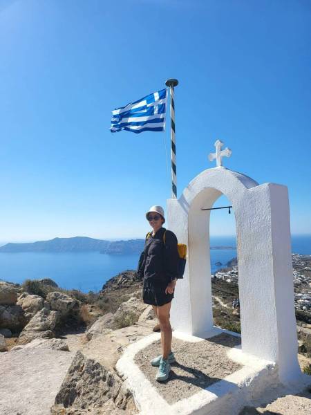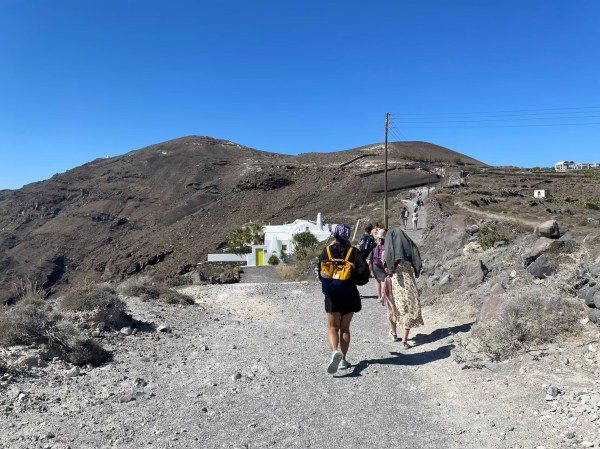 อันที่จริงพวกเราก็ใช่จะพร้อมเดินเทรคอะไรกันหรอกนะ เสื้อผ้าก็มาแบบจัดเต็มเพื่อถ่ายรูปสวย ๆ ที่ Oia โดยเฉพาะ แต่ถึงอย่างนั้นก็ยังสนุกกับเส้นทาง แม้แดดจะแรง เดินไปสักพักก็เจอช่วงทางราบอยู่บ้าง ก่อนจะเริ่มไต่เนินผ่านช่องเขา อากาศร้อนจัดมาก มีเพื่อนเห็นรถบัสวิ่งผ่าน ก็แอบเสนอว่าถ้าเหนื่อยจะโบกไหม แต่ฉันยืนยันว่าอยากเดินต่อให้ครบ และขอให้เงียบไว้กลัวเพื่อนคนอื่นจะเปลี่ยนใจวิ่งขึ้นรถกันซะก่อน