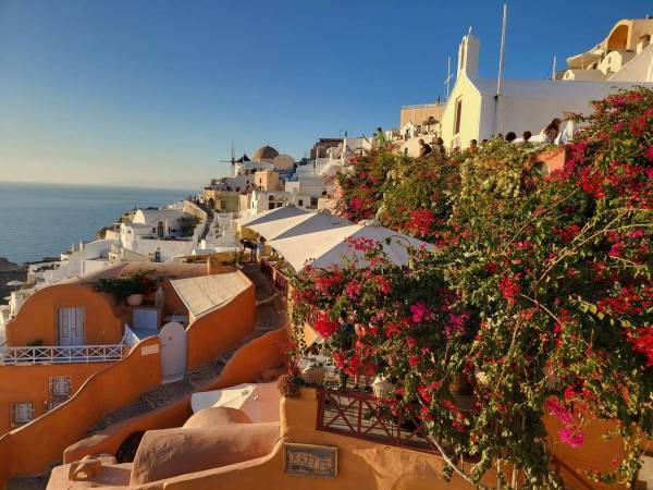 บ้านเรือนสีขาวสะอาดตา เรียงรายลดหลั่นไปตามแนวเขาที่เคยเป็นปากปล่องภูเขาไฟเก่า กลายเป็นเสน่ห์เฉพาะตัวที่ดึงดูดผู้คนจากทั่วโลกให้แวะมาเพื่อถ่ายรูป จริง ๆ