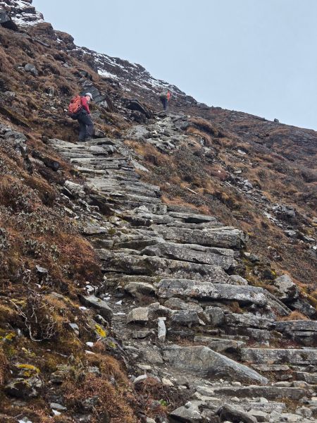 เส้นทางเริ่มชันขึ้นเรื่อย ๆ หิมะหนาและลื่น ต้องก้าวอย่างระวัง พอเห็นธงทิเบตข้างหน้า ความเหนื่อยก็เหมือนจางลง แต่เมื่อถึงตรงนั้นถึงรู้ว่า ธงตรงนี้แค่จุดเริ่มต้นทางฟากนี้ เรายังต้องเดินบนเขาอีกไกลเพื่อไปยังอีกฟากนึงเพื่อลงเขา เส้นทางไกลต้องไต่ขึ้นอีกร้อยเมตรในเส้นทางหิมะที่ขาวโพลน เพื่อไปยังอีกฝั่งที่มีธงแขวนอยู่ตรงเจดีย์ ก่อนจะลงทางชันสุดๆอีกสามร้อยเมตรเพื่อไปถึงที่พักตรงเชิงเขา